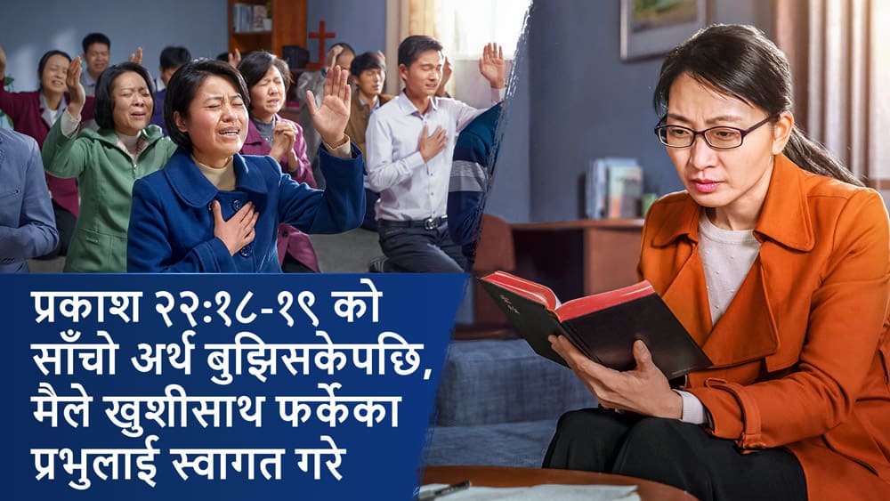 जब उनले मेरो कुरा सुने, उनी मुस्कुराए र जबाफ दिए, “धेरै मानिसहरूले यी वचनहरू पढ्छन् र परमेश्वरका सबै वचनहरू बाइबलमा छन्, परमेश्वरले बाइबलदेखि बाहिर केही बोल्नुभएको छैन, र यदि कसैले उहाँले बोल्नुभएको दाबी गर्छ भने, तिनीहरूले बाइबलमा थपिरहेका हुन्छन् भनी विश्वास गर्छन्। तर धेरैचोटि हामी यो विचार तथ्यहरूसँग मिल्छ कि मिल्दैन भनी विचार गर्दैनौं। यो पदहरूमा संकेत गरिएको ‘त्यसमा थप्न वा त्यसबाट घटाउन सकिंदैन’ को वास्तविक अर्थ के हो? यस खण्डबाट हामी जान्दछौं कि यूहन्नाले ‘यस भविष्यवाणी’मा केही थप्ने मानिसहरूको विषयमा संकेत गरिरहेका थिए। तिनले ‘बाइबल’मा केही थप्ने सम्बन्धमा केही भनेनन्। साथै, जब यूहन्नाले यी वचनहरू भने, बाइबलमा नयाँ करार थिएन, बाइबलमा नयाँ र पुरानो करारहरू हुने कुरा त परै जाओस। नयाँ करार ख्रीष्टाब्द ३०० तिर संकलित गरिएको थियो, र प्रभु येशूले उहाँ जानुभएको करिब ९० वर्षपछि यूहन्नालाई प्रकाशको पुस्तक लेख्न प्रेरित गर्नुभयो। स्पष्ट छ, यूहन्नाले ‘यस पुस्तक’ भन्नुको अर्थ प्रकाशको पुस्तक थियो, सम्पूर्ण बाइबल होइन, र ‘त्यसमा थप्न वा त्यसबाट घटाउन सकिंदैन’ भनाइको अर्थ प्रकाशको पुस्तकमा भएका अगमवाणीहरूमा त्यसमा थप्न वा त्यसबाट घटाउन सकिंदैन भनिएको हो। तर केही मानिसहरूले यी पदहरूको वास्तविक अर्थ बुझ्दैनन्, बरु तिनीहरू यसको अर्थ बाइबलमा केही पनि थप्न सकिंदैन भनी सोच्छन्। तिनीहरू परमेश्वरका सबै वचनहरू बाइबलमा छन् र परमेश्वरको वचनहरू र काम बाइबलबाहिर छैनन् भनी दाबी गर्छन्, त्यसैले उनीहरू बाइबलबाहिर मण्डलीहरूसँग पवित्र आत्माले बोल्नुभएका वचनहरू खोज्न वा परमेश्वरको नयाँ कामको अनुसन्धान गर्न कोसिस गर्ने हिम्मत गर्दैनन्, जसले तिनीहरूलाई थुमाको पाइला पछ्याउन असफल तुल्याउँदछ, र आखिरी दिनहरूमा परमेश्वरको मुक्तिलाई ढोका बाहिर छोड्दछन्। मानिसहरूले यी पदहरूलाई अशुद्ध प्रकारले बुझेकोले यस्तो नतिजा भएको हो!” उनको सङ्गति सुनेपछि मात्र मैले अन्त्यमा “यस पुस्तक” भनेर यूहन्नाले बाइबल होइन, प्रकाशको पुस्तकलाई संकेत गरिरहेका थिए भनी बुझें, र जब यूहन्नाले प्रकाशको पुस्तक लेखेका थिए, त्यस बेला नयाँ करार छँदैथिएन, पुरानो र नयाँ करारहरूको कुरा त परै जाओस। साथै, तिनले “त्यसमा थप्न वा त्यसबाट घटाउन सकिंदैन,” भन्नुको अर्थ प्रकाशको पुस्तकमा भएका अगमवाणीहरूमा थप्न वा घटाउन हुँदैन भन्ने थियो। तर हामीले यो सम्पूर्ण बाइबलको विषयमा भनिएको हो भनी विश्वास गरेका थियौं! हामी धेरै अनभिज्ञ थियौं!